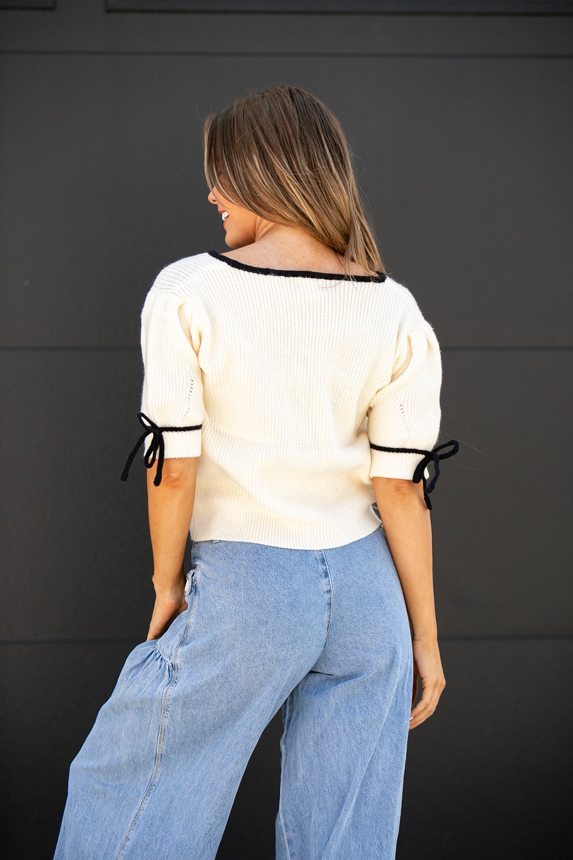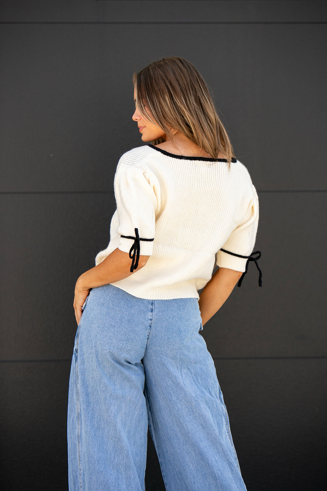 The Elaine sweater is a charming piece with functional buttons down the front. This sweater has short sleeves, enhanced by delicate piping at the V-neck and the ties at the elbows add a playful touch, making it a unique and stylish addition to your wardrobe.