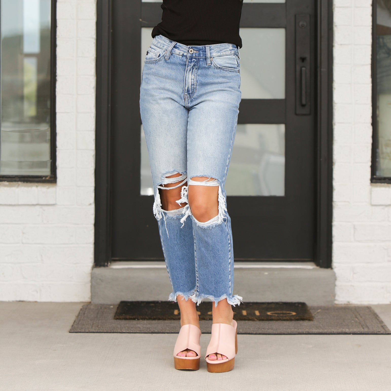 Introducing our High Rise Mom Jeans, a timeless and versatile addition to your denim collection. These relaxed-fit denim jeans offer a comfortable and laid-back style that effortlessly elevates any outfit. The shark bite chew hem adds a trendy and edgy touch, giving these jeans a unique and fashion-forward look. With a medium stone wash and rigid denim construction, these jeans exude a cool and vintage-inspired vibe. The high-rise design provides a flattering fit and pairs perfectly with crop tops, tucked-in blouses, or oversized sweaters. Embrace the casual yet chic aesthetic with our High Rise Mom Jeans and showcase your individuality with confidence.