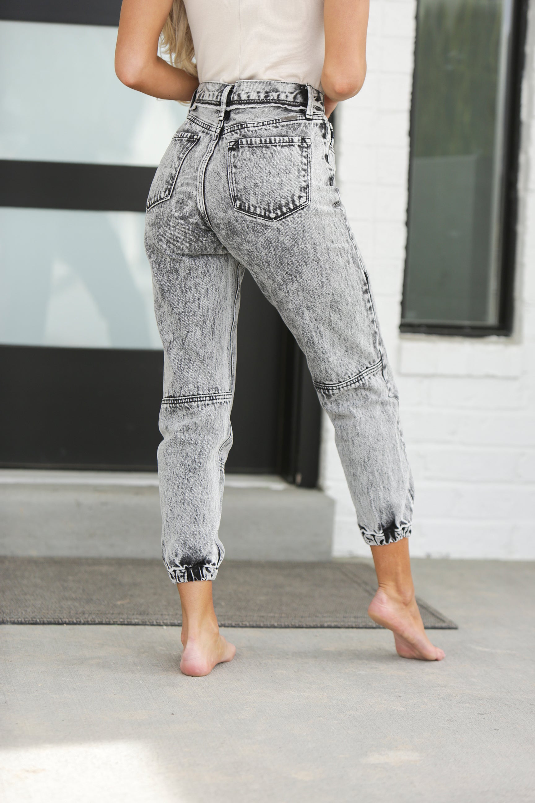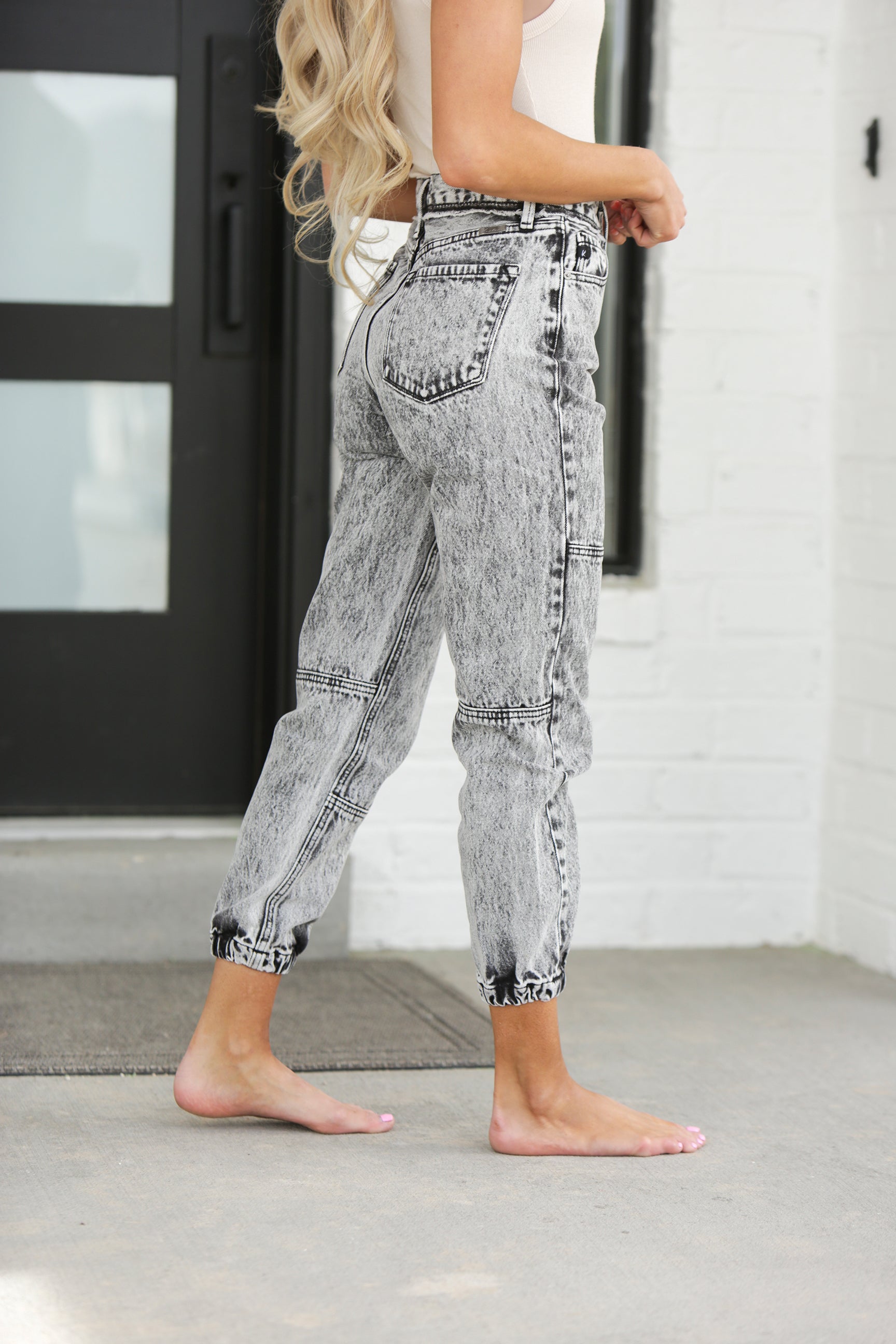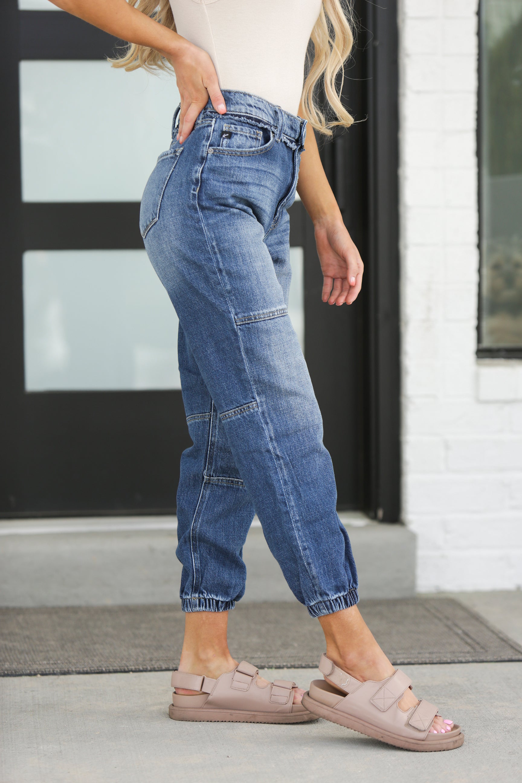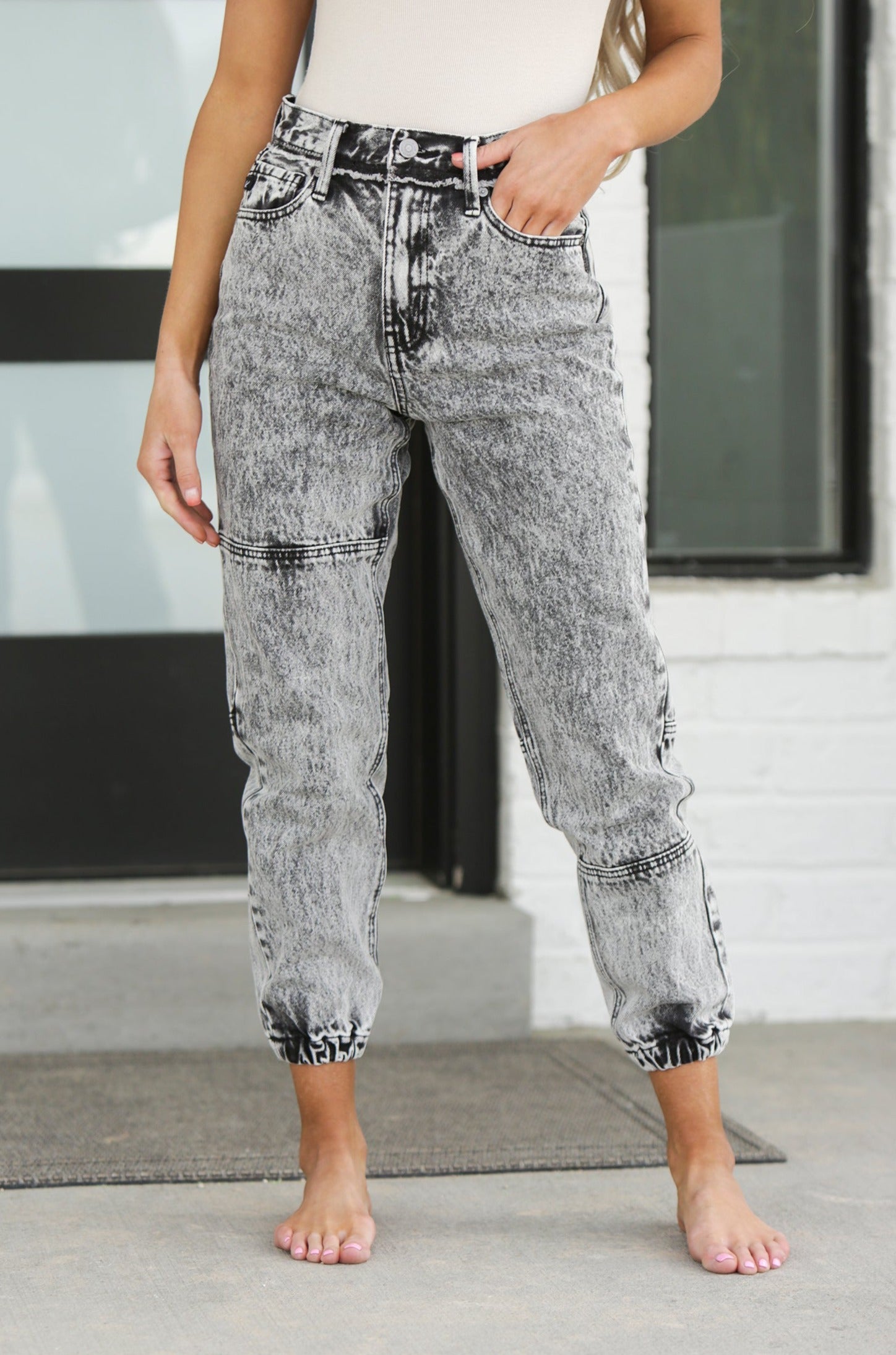 Our Kancan Jean Jogger features a scrunch elastic band above the ankles to give it a casual yet chic look. Sits high above the natural waistline as it relaxes down the leg and finishes above the ankle. The Jogger features symmetric and asymmetric stitch detail. On top of this modern pattern, it also has a contrasting dark trim right at the belt loop with a frayed design to give it that next level of style. Choose from different jean washes.