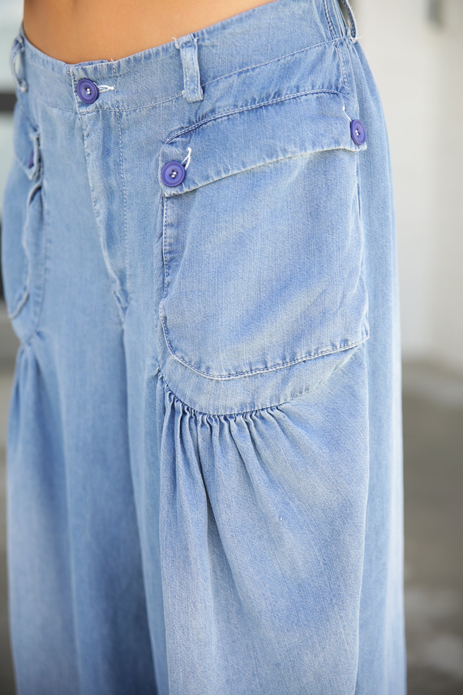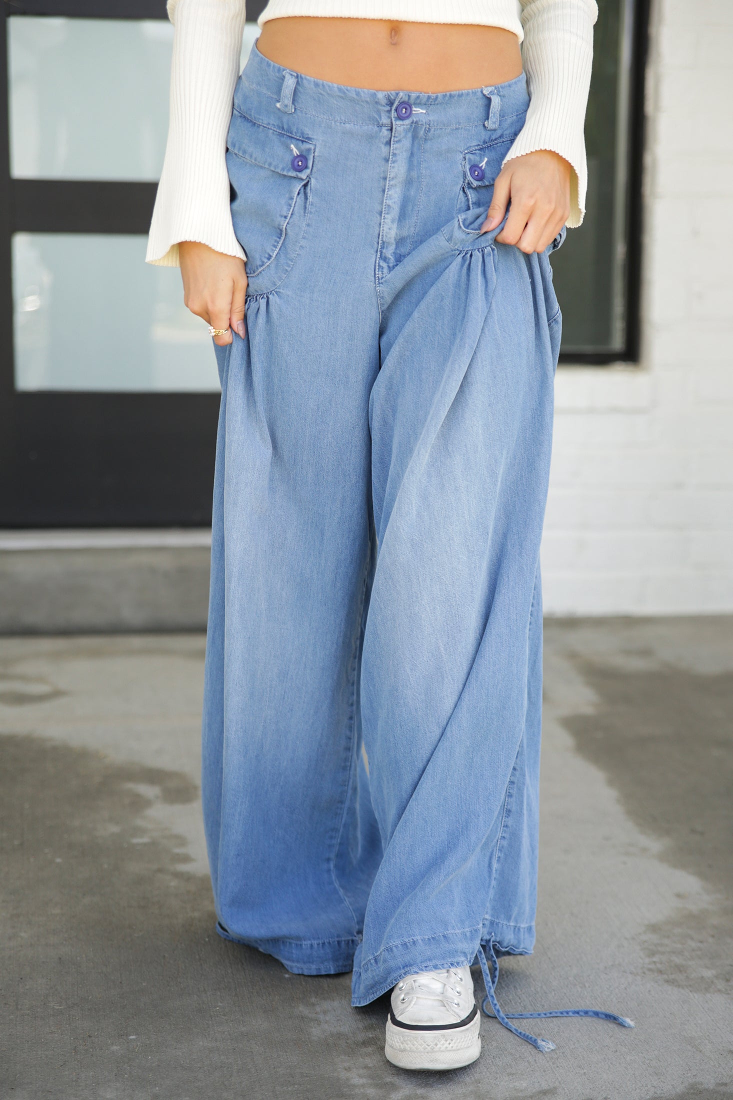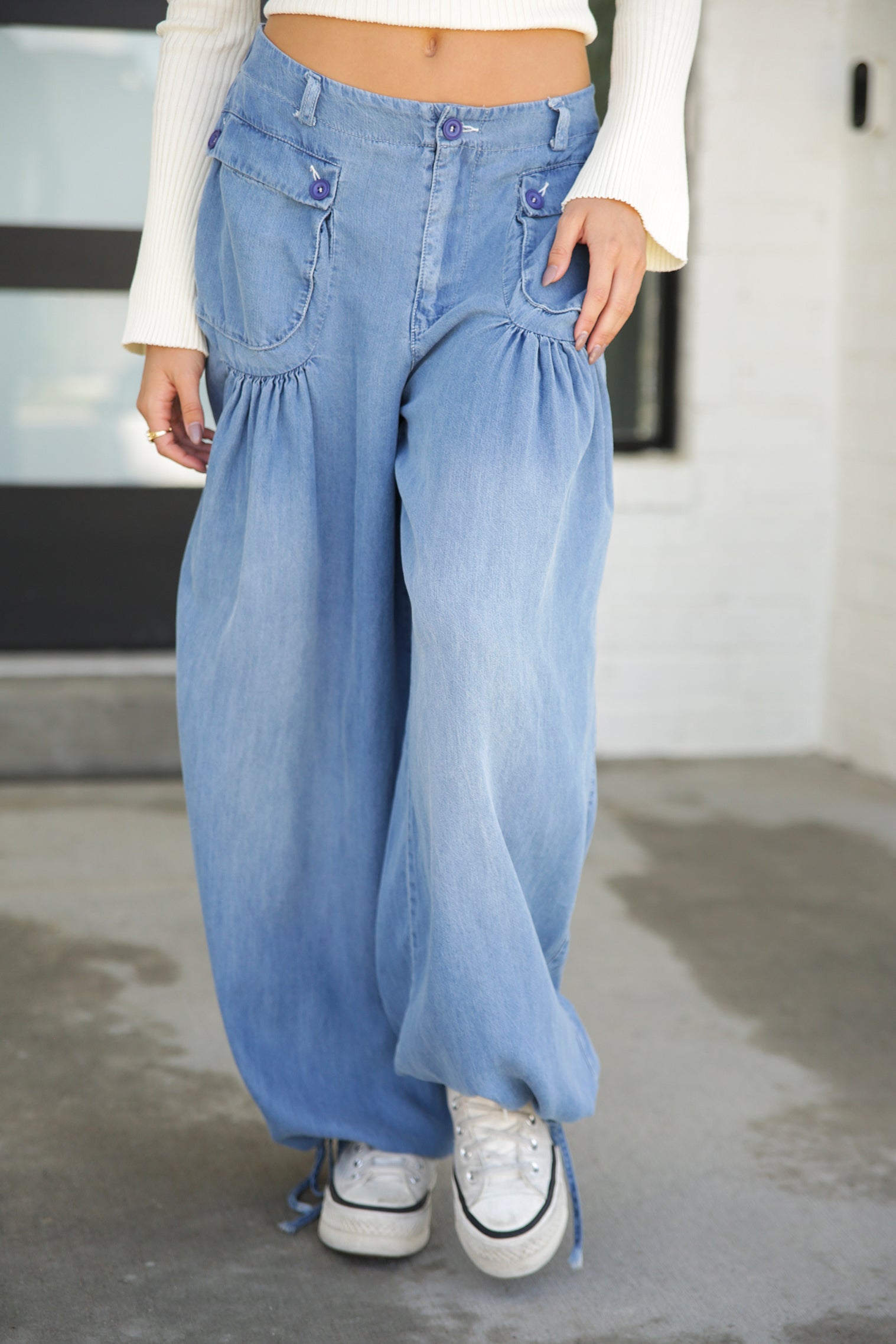 Stand out in these unique Washed Wide Tencel Pants. You'll love the funky, front pockets, ballooned fit and the fashionable and functional tie at the hem. You won’t want to take them off!